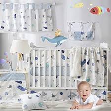 Reversible quilt fitted crib sheet 3-sided dust ruffle and plush whale all made with super-soft microfiber fabrics. You can go for a preppy upscale look by using the Come Sail Away Nautical Bedding set that features pretty red sailboats and candy striped lighthouses that make you feel as though you are living. Nautical 4 Piece Whales Baby Crib Bedding Set.