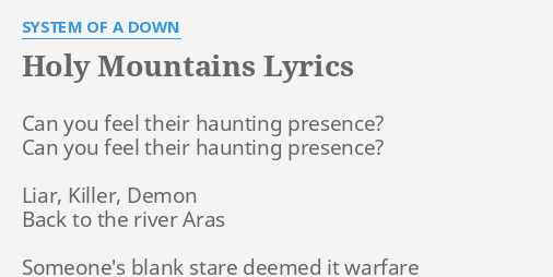 Ahhhh Ahhhh Ahhhh Ahhhh. Holy Mountains Lyrics by System of a Down from the Hypnotize album - including song video artist biography translations and more. This is the second System Of A Down song about the Armenian genocide following PLUCK. Ahhhh Ahhhh Ahhhh Ahhhh. The lyrics to SOADs holy mountainsDISCLAIMERi dont own this song so yaplease dont delete it. SYSTEM OF A DOWNSerj Tankian -- vocals keyboards guitars graphic design string arrangementDaron Malakian -- vocals guitars bass keyboards production. You May Also Like. Ahhhh Ahhhh Ahhhh Ahhhh. Search for System Of A Down Lyrics Music Videos and MP3 downloads.